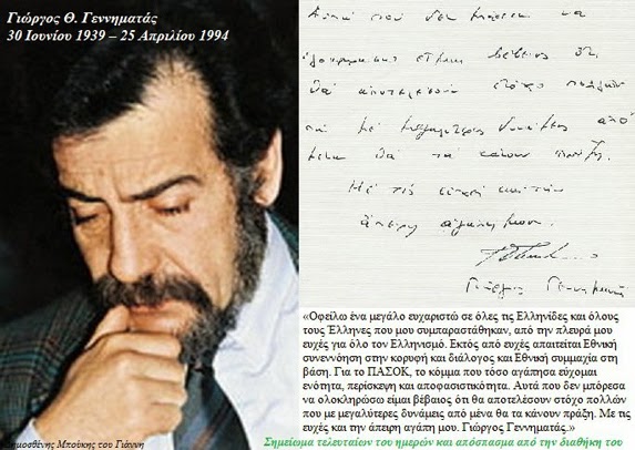 «Η καρδιά του Γ. Γεννηματά έπαψε να κτυπά στις 9.15 π.μ., σήμερα το πρωί». Με τη λιτή αυτή ανακοίνωση, λιτή όπως και η ζωή του, οι γιατροί του Γιώργου Γεννηματά ανακοίνωσαν το θάνατό του, πριν από 25 χρόνια. Σε λίγες ημέρες, στις 25 Απριλίου, είναι η επέτειος από το θάνατό του το 1994.