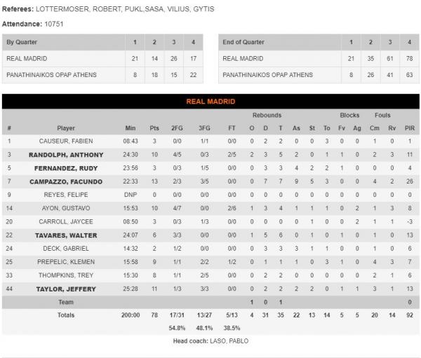Από τη Ρεάλ Μαδρίτης οι Τέϊλορ (11π.), Καμπάτσο (13π, 7ας, 9ας), Πρέπελιτς (9π.) και Ράντολφ (10π., 5ρ) ήταν οι καλύτεροι, ενώ από τον Παναθηναϊκό ουδείς διασώθηκε…