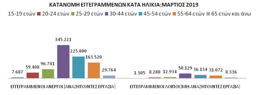 Το σύνολο των επιδοτούμενων ανέργων, για τον Μάρτιο του 2019, (αφορά τον αριθμό των δικαιούχων που πληρώθηκαν εντός του αντίστοιχου μήνα) ανήλθε σε 167.910 άτομα, από τα οποία οι 117.551 (ποσοστό 70,01%) είναι «κοινοί και λοιπές κατηγορίες επιδοτουμένων» και οι 50.359 (ποσοστό 29,99%) είναι εποχικοί τουριστικών επαγγελμάτων. Οι άνδρες ανήλθαν σε 79.048 (ποσοστό 47,08%) και οι γυναίκες σε 88.862 (ποσοστό 52,92%).
