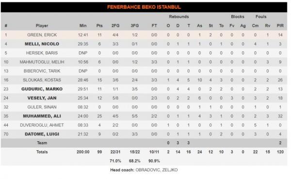 Γενικότερα οι Τούρκοι είχαν τρομερή ευστοχία με 15/22 τρίποντα, 22/31 δίποντα και 10/11 βολές, ενώ ακόμη μοίρασαν 24 ασίστ και έκαναν 12 κλεψίματα!