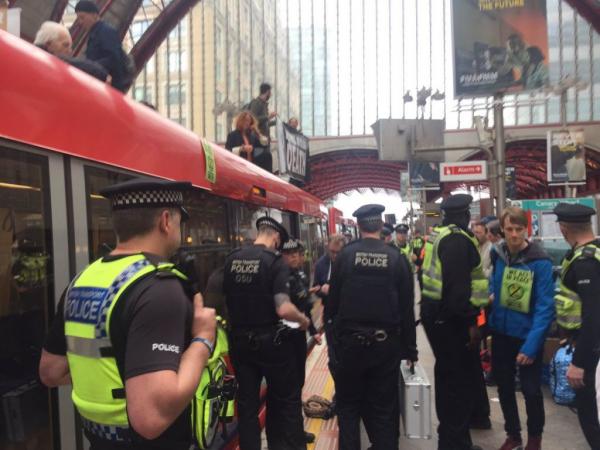 Την ίδια ώρα τέσσερις ακτιβιστές της οργάνωσης σκαρφάλωσαν πάνω σε τρένο στο Κάναρι Γουόρφ και στέκονται όρθιοι στην οροφή του, κρατώντας πανό με συνθήματα κατά της κλιματικής αλλαγής, ενώ μια άλλη ακτιβίστρια κόλλησε το χέρι της πάνω σε ένα βαγόνι.