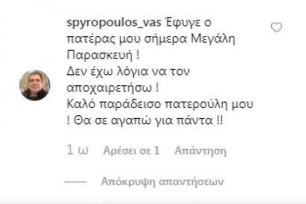 Στην ίδια ανάρτηση έκανε σχόλιο ο ίδιος ο πατέρας της Κωνσταντίνας Σπυροπούλου, και αποκάλυψε πως εχθές άφησε την τελευταία του πνοή ο πατέρας του, με ένα συγκινητικό σχόλιο.