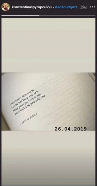 Σήμερα η Κωνσταντίνα ανέβασε και ένα story που έγραφε: «I am sorry this world could not keep you safe. May your journey home be a soft and peaceful one. Rest in Peace», δηλαδή: «Λυπάμαι που δεν σε κράτησε ασφαλή αυτός ο κόσμος. Ας είναι το ταξίδι σου σπίτι απαλό και ήρεμο. Αναπαύσου εν ειρήνη».