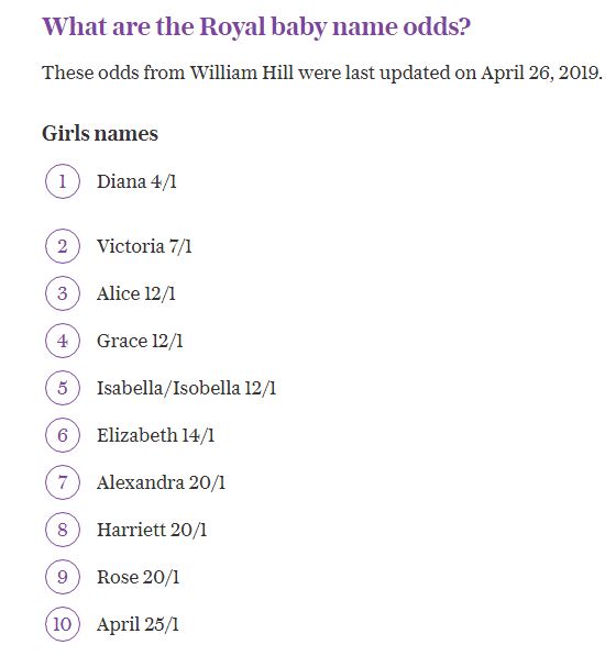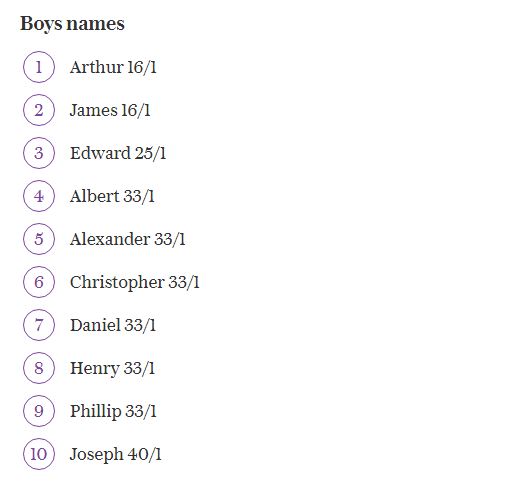 Βέβαια, σε περίπτωση που το παιδί είναι αγόρι τα γραφεία στοιχημάτων πιστεύουν ότι το πιο πιθανό είναι να ονομαστεί Άρθουρ. Ακολουθούν τα ονόματα Τσαρλς, Τζέιμς, Έντουαρντ, Αλεξάντερ, Τζέικομπ και Φράνσις.