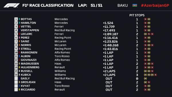 Ο Φινλανδός, παρά την πίεση που του άσκησε ο Χάμιλτον στους τελευταίους πέντε γύρους, πήρε τη νίκη και έφτασε τους 87 βαθμούς, ενώ ο Βρετανός πιλότος έχει 86 και ο Φέτελ 52, με τον Φερστάπεν να ακολουθεί με 51.