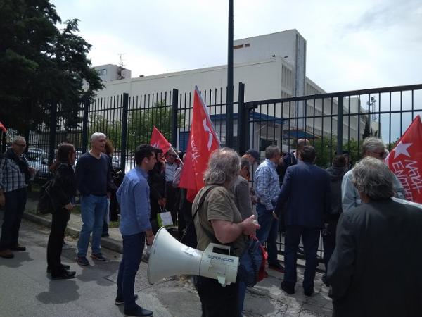 Συγκέντρωση διαμαρτυρίας έξω από το Ραδιομέγαρο της ΕΡΤ πραγματοποίησαν το μεσημέρι της Πρωτομαγιάς στελέχη της ΛΑΕ με επικεφαλής τον Παναγιώτη Λαφαζάνη.