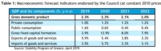 * Το Συμβούλιο «στηρίζει» τη μείωση της πρόβλεψης για τον ρυθμό ανάπτυξης των επενδύσεων (ακαθάριστες επενδύσεις παγίου κεφαλαίου) για το 2019 στο 3,9% αντί προηγούμενου στόχου για 12,1%, ως πιο ρεαλιστικό σενάριο.