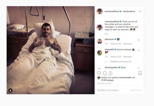 Ο Βιεϊρίνια δέχτηκε πολλά μηνύματα στήριξης από τον κόσμο του ΠΑΟΚ και αυτός από την πλευρά του απάντησε μέσω Instagram, τονίζοντας τα εξής: «Ευχαριστώ για όλες τις ευχές και για τα θετικά σας μηνύματα. Επέστρεψα στο δωμάτιο μου και είμαι έτοιμος να ξεκινήσω την αποθεραπεία μου».