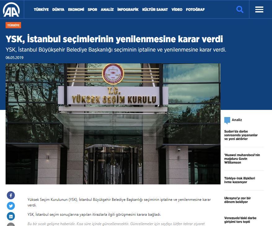 Το δημοσίευμα του τουρκικού πρακτορείου ειδήσεων Anadolu για την επανάληψη των εκλογών στην Κωνσταντινούπολη.