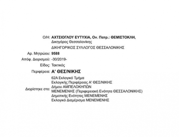 Καθήκοντα δικαστικής αντιπροσώπου σε τμήμα στην Μενεμένη Θεσσαλονίκης για τις ευρωεκλογές και αυτοδιοικητικές εκλογές της 26ης Μαΐου κλήθηκε να αναλάβει η… υπουργός Εργασίας Έφη Αχτσιόγλου.
