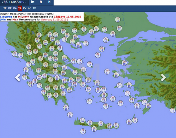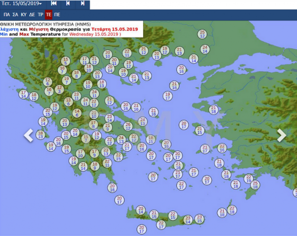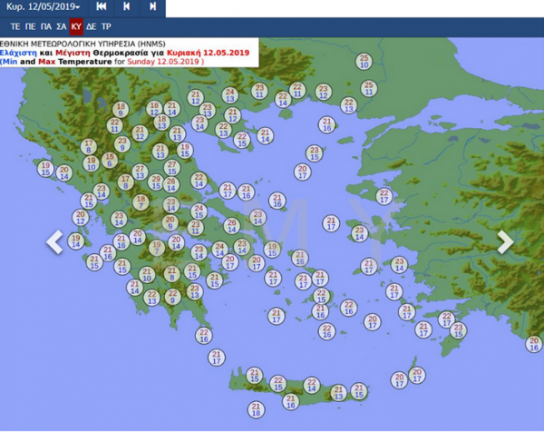 Η θερμοκρασία στη Δυτική Μακεδονία θα κυμανθεί από 6 έως 22 βαθμούς, στην υπόλοιπη Μακεδονία και τη Θράκη από 8 έως 26, στα δυτικά ηπειρωτικά από 10 έως 24, στα υπόλοιπα ηπειρωτικά από 12 έως 27, στα νησιά του Ιονίου από 13 έως 25, στα νησιά του Αιγαίου από 13 έως 24, και στην Κρήτη από 10 έως 25.