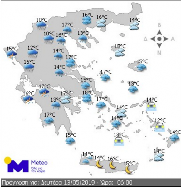 Στο Ιόνιο, τα ηπειρωτικά και βαθμιαία το βόρειο Αιγαίο νεφώσεις με βροχές και καταιγίδες. Τα φαινόμενα πιθανώς να είναι τοπικά ισχυρά στα δυτικά, τα κεντρικά και τα βόρεια, εκτός από την ανατολική Μακεδονία και τη Θράκη. Στην υπόλοιπη χώρα λίγες νεφώσεις παροδικά αυξημένες, με τοπικές βροχές από το μεσημέρι στις Κυκλάδες, όπου θα εκδηλωθούν και μεμονωμένες καταιγίδες. Οι άνεμοι θα πνέουν νότιοι νοτιοανατολικοί 4 με 6 και στα πελάγη τοπικά 7 μποφόρ, με μικρή εξασθένηση στα δυτικά από το βράδυ. Η θερμοκρασία θα σημειώσει πτώση στο Ιόνιο και τα ηπειρωτικά.