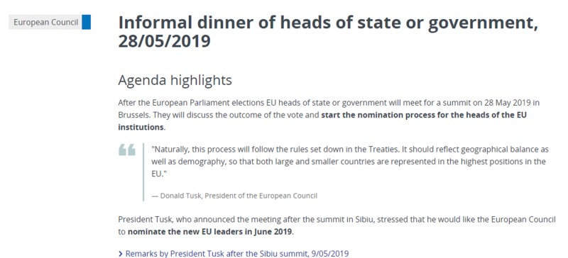 Σύμφωνα με όσα αναφέρονται μέχρι στιγμής, στις 28 Μαΐου, οι αρχηγοί των κυβερνήσεων της Ε.Ε θα συζητήσουν τα αποτελέσματα των ευρωεκλογών και θα ξεκινήσουν τη διαδικασία υποβολής υποψηφιοτήτων για τους επικεφαλής των θεσμικών οργάνων της Ε.Ε.
