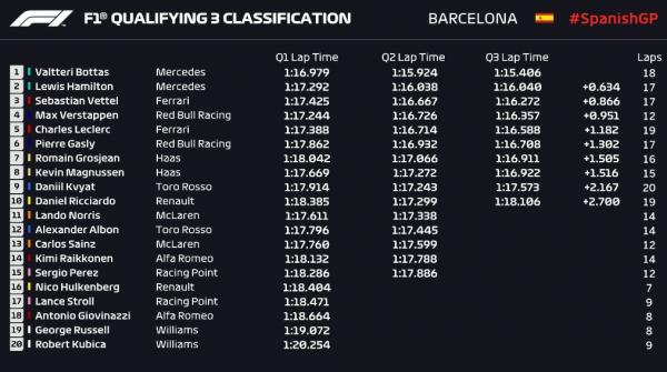 Πίσω από τους δύο οδηγούς της Mercedes, θα ξεκινήσει αύριο ο Σεμπάσταν Φέτελ με Ferrari ενώ σφήνα στα μονοθέσια της Scuderia κατάφερε να μπει ο Μαξ Φερστάπεν που ξεκινά 4ος, με τον Λεκλέρκ στην 5η θέση.