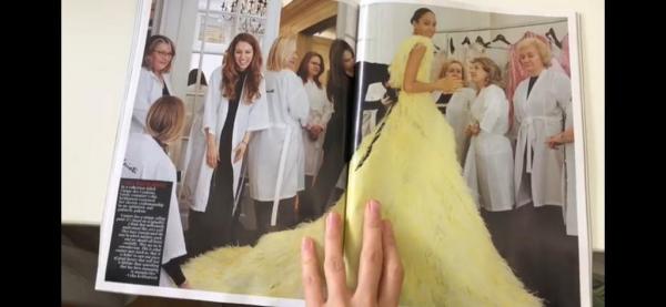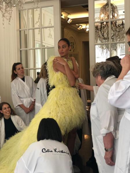 Οι φωτογραφίες μέσα από τον ιστορικό οίκο και το όμορφο νεοκλασικό της οδού Δαιδάλου με το πασίγνωστο μοντέλο, είναι σε ένα πλούσιο τεύχος της «καλοκαιρινής έκδοσης» της Vogue. Η Τζόαν φοράει ένα εντυπωσιακό φόρεμα με φτερά, σε εκρηκτικό κίτρινο, όπως και άλλα φορέματα της Haute Couture κολεξιόν…