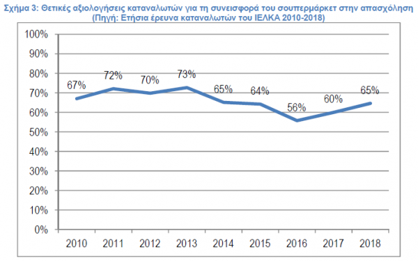 Διαχρονικά, την περίοδο 2010-2018 σύμφωνα με τα στοιχεία της ετήσιας έρευνας καταναλωτών του ΙΕΛΚΑ το αγοραστικό κοινό αξιολογεί ιδιαίτερα θετικά τη συμβολή του σουπερμάρκετ στην απασχόληση (τα χαμηλότερα ποσοστά κατεγράφησαν το 2016 περίοδο με σημαντικά προβλήματα για δύο από τις τότε ηγέτιδες εταιρείες του κλάδου, τα οποία όμως και πάλι ήταν σημαντικά θετικά).