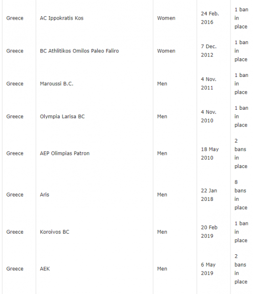 Συγκεκριμένα, στην επίσημη ιστοσελίδα της FIBA υπάρχει ένα ban από τις 6 Μαΐου, ενώ πλέον προστέθηκε ένα ακόμα με ημερομηνία 16/5. Το δεύτερο αφορά την περίπτωση του Αμερικανού γκαρντ της Βίρτους Μπολόνια, ο οποίος έχει προσφύγει στο BAT (Basketball Arbitral Tribunal) και διεκδικεί μισθούς και bonus επίτευξης στόχων.