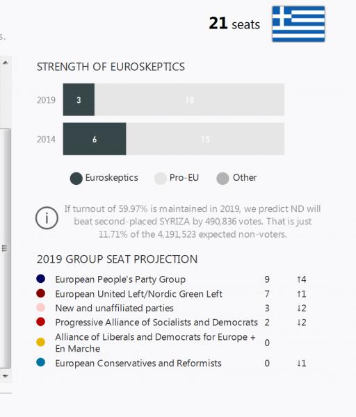 Σύμφωνα με την εκτίμηση του Politico.eu, η Νέα Δημοκρατία θα καταλάβει εννιά έδρες στην Ευρωβουλή, έναντι επτά του ΣΥΡΙΖΑ και δύο του ΚΙΝΑΛ και της Χρυσής Αυγής, ενώ το ΚΚΕ φαίνεται να καταλαμβάνει μία έδρα.