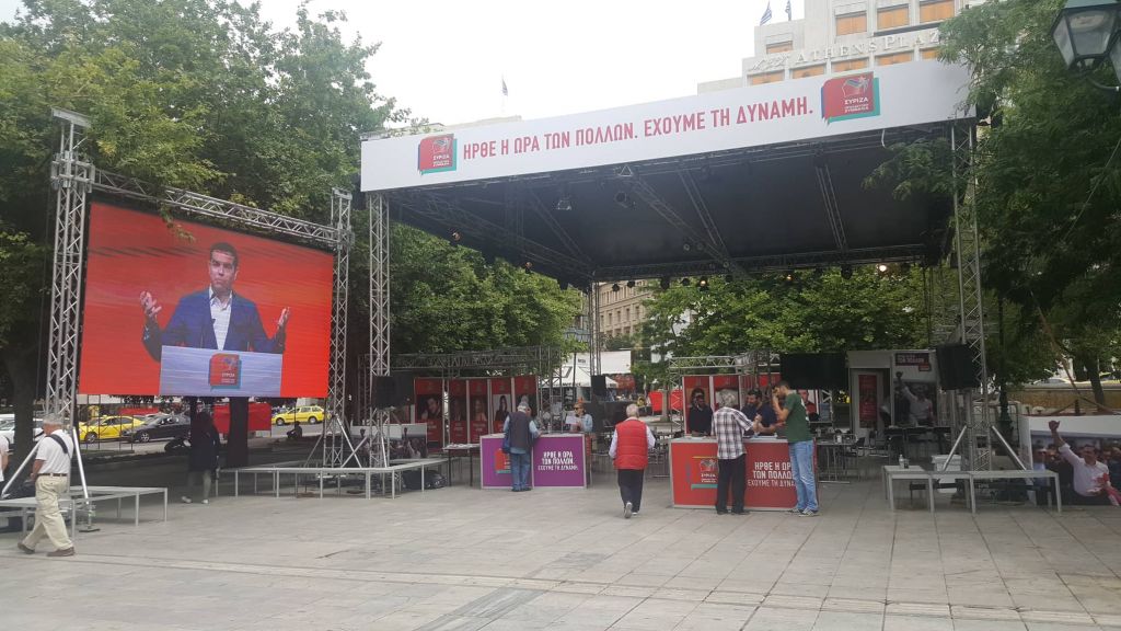 Μεγαφωνικές εγκαταστάσεις, γιγαντοοθόνες, δεκάδες τραπεζάκια, καθώς και μικρές εξέδρες συνθέτουν το σκηνικό… παρατυπίας κάτω από το Κοινοβούλιο, σε μια όχι πρωτοφανή πάντως για τα ελληνικά δεδομένα ενέργεια.
