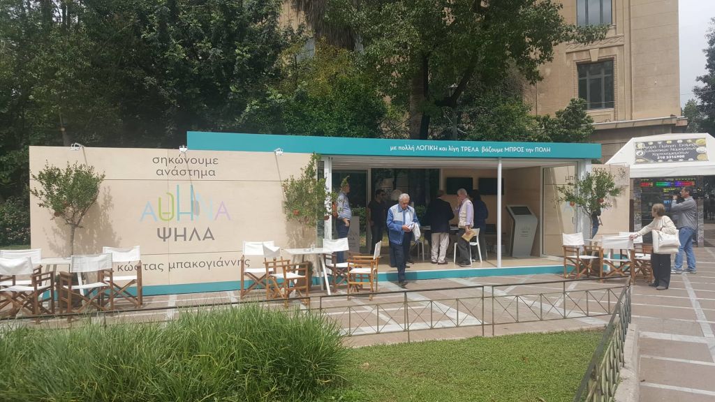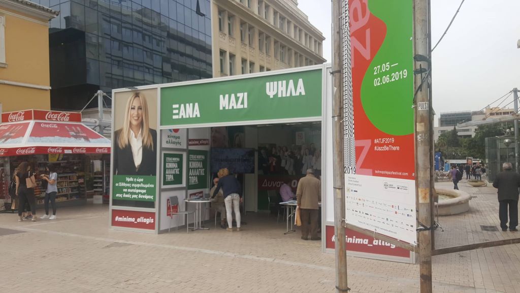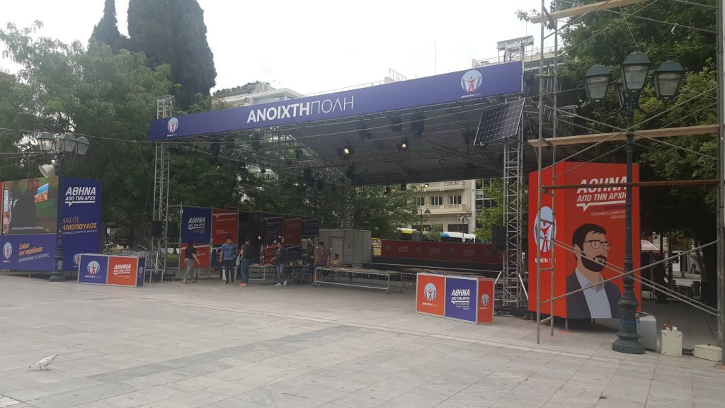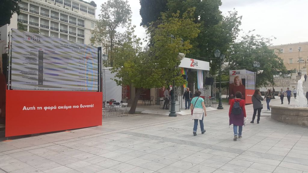 Ξεκινώντας την περιήγησή μας από την πλατεία Συντάγματος, στο δεξί μας χέρι (προς την οδό Βασ. Γεωργίου Α’) έχει στηθεί το εκλογικό περίπτερο της υποψήφιας περιφερειάρχου Αττικής, Ρένας Δούρου, το οποίο σε συνδυασμό με αυτό του ΣΥΡΙΖΑ και του υποψήφιου δημάρχου Αθηναίων, Νάσου Ηλιόπουλου, που βρίσκονται αμέσως πιο κάτω, έχουν καλύψει σχεδόν όλη την έκταση της πλατείας Συντάγματος.