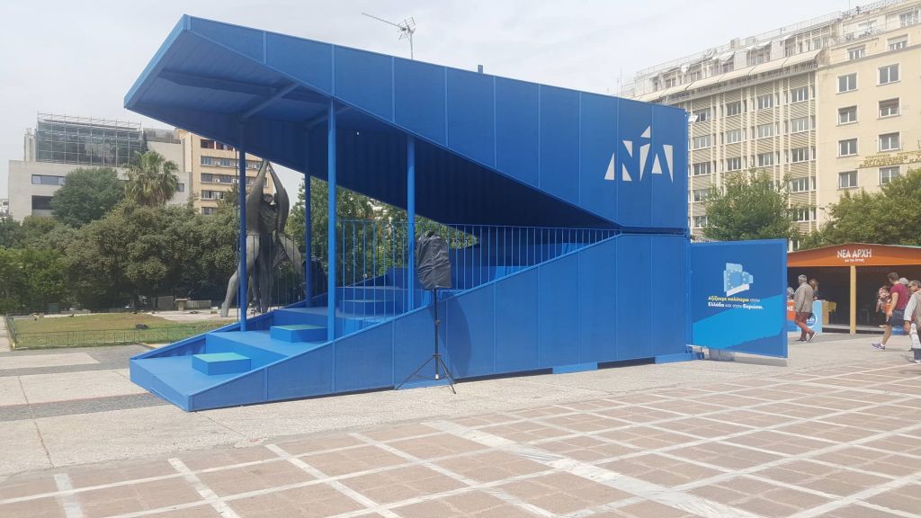 Στην πλατεία Κλαυθμώνος δε, δεσπόζουν τα εκλογικά περίπτερα της Νέας Δημοκρατίας και του υποστηριζόμενου από την Πειραιώς υποψήφιου περιφερειάρχη Αττικής, Γιώργου Πατούλη. Ξανά γιγαντοοθόνες και κατάληψη μεγάλου μέρους πλατείας.