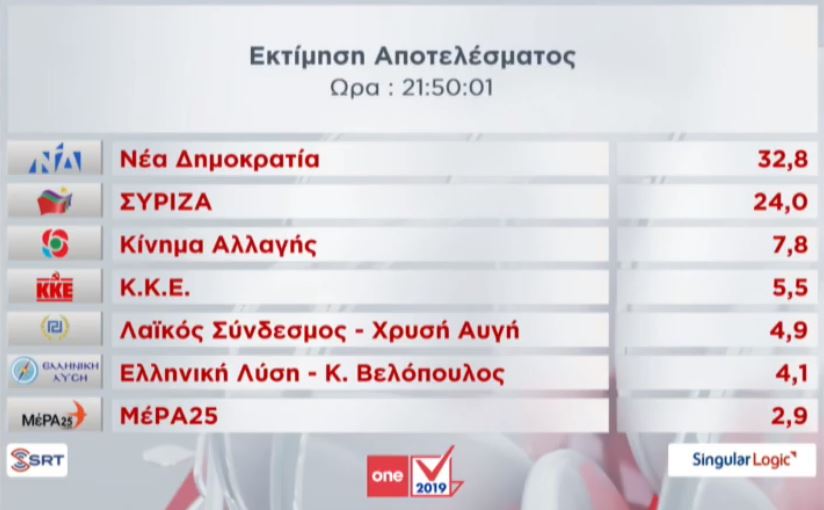 Η ΝΔ, βάσει των στοιχείων του υπουργείου Εσωτερικών, λαμβάνει ποσοστό 32,8% ενώ το κυβερνών κόμμα δεν καταφέρνει να ξεπεράσει το 24%. Στην τρίτη θέση βρίσκεται καθαρά το Κίνημα Αλλαγής με 7,8% και ακολουθεί το ΚΚΕ με 5,5%.