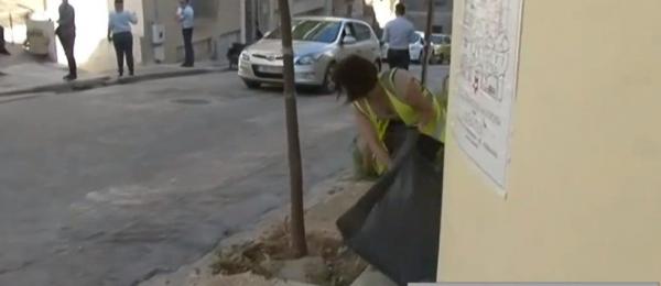 Η κάμερα του ΣΚΑΪ κατέγραψε το περιστατικό δείχνοντας μια δημοτική υπάλληλο του τομέα Καθαριότητας να ξεχορταριάζει το χώρο μπροστά από το εκλογικό κέντρο.