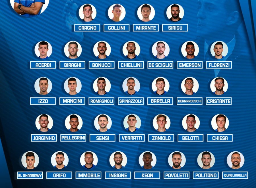 Αναλυτικά, η προεπιλογή: Κράνγκο, Γκολίνι, Μιράντε, Σιρίγκου, Ατσέρμπι, Μπιράγκι, Μπονούτσι, Κιελίνι, Ντε Σίλιο, Έμερσον, Φλορέντσι, Ίζο, Μαντσίνι, Ρομανιόλι, Σπινατσόλα, Μπαρέλα, Μπερναρντέσκι, Κρισάντε, Ζορζίνιο, Πελεγκρίνι, Σένσι, Βεράτι, Ζανιόλο, Μπελότι, Κιέζα, Ελ Σαράουϊ, Γκρίφο, Ιμόμπιλε, Ινσίνιε, Κεάν, Παβολέτι, Πολιτάνο, Κουαλιαρέλα.