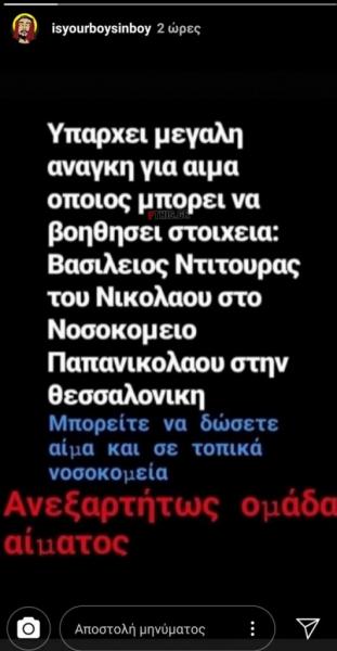 Έτσι ο ίδιος κάλεσε όσους followers του μπορούν να δώσουν αίμα σε όποιο νοσοκομείο μπορούν, για τον Βασίλη Ντίτουρα, ο οποίος νοσηλεύεται στο νοσοκομείο Παπανικολάου στη Θεσσαλονίκη.