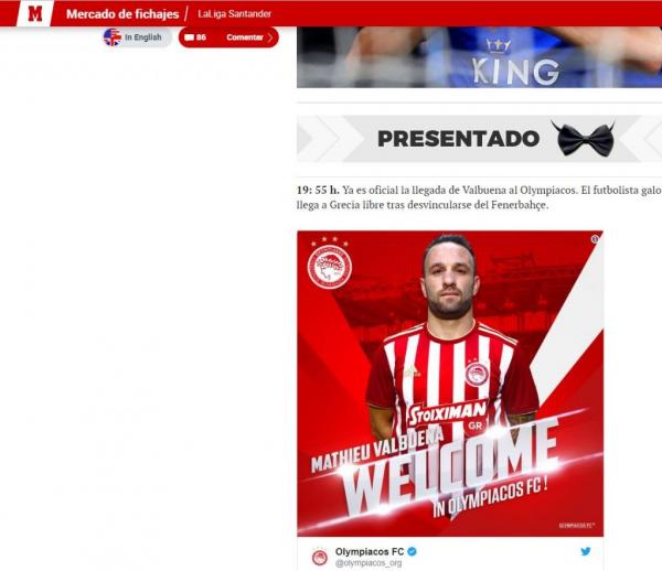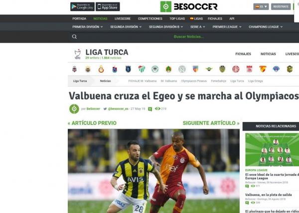 Besoccer.com: «Ο Βαλμπουενά διασχίζει το Αιγαίο και παίρνει μεταγραφή στον Ολυμπιακό»