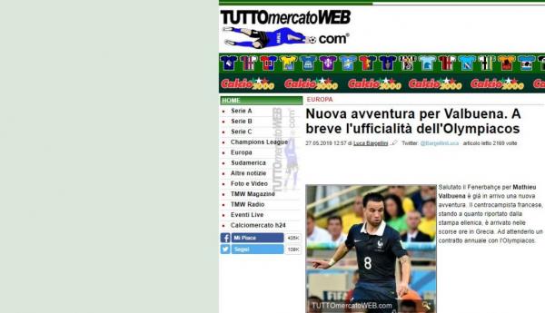 Tuttο Mercato: «Νέα πρόκληση για τον Βαλμπουενά η μεταγραφή του στον Ολυμπιακό»