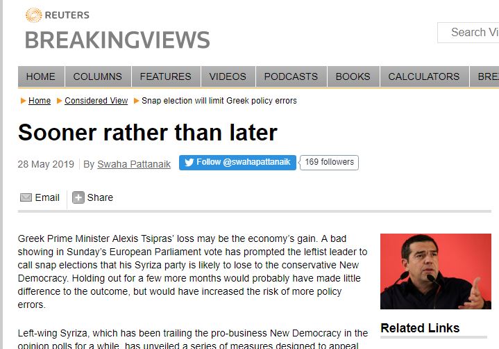 Όπως αναφέρει, «οι άσχημες επιδόσεις στις ευρωεκλογές της Κυριακής οδήγησαν τον αριστερό ηγέτη σε προκήρυξη πρόωρων εκλογών, που ο ΣΥΡΙΖΑ ενδέχεται να χάσει από τη συντηρητική Νέα Δημοκρατία.»