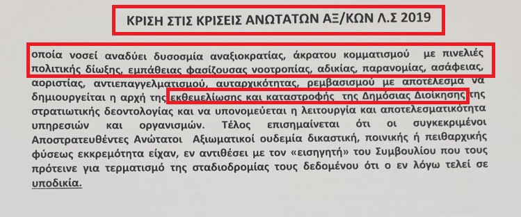 «Η διαδικασία των τακτικών κρίσεων του Λιμενικού Σώματος αποτελεί παράδειγμα προς αποφυγή, δεδομένου ότι η ασθένεια από τη οποία νοσεί αναδύει δυσοσμία αναξιοκρατίας, άκρατου κομματισμού με δείγματα πολιτικής δίωξης και ρεβανσισμού. Με αποτέλεσμα να δημιουργούνται προϋποθέσεις εκθεμελίωσης και καταστροφής της Δημόσιας Διοίκησης, της στρατιωτικής δεοντολογίας και να υπονομεύεται η λειτουργία και η αποτελεσματικότητα υπηρεσιών και οργανισμών. Επισημαίνεται ότι οι αποστρατευθέντες αξιωματικοί ουδεμία δικαστική, ποινική η πειθαρχικής φύσεως εκκρεμότητα είχαν, εν αντιθέσει με αξιωματικούς που προχώρησαν σε αυτές τις επιλογές».
