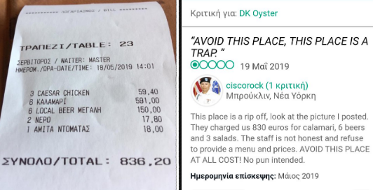 Πρόστιμο σχεδόν 420.000 ευρώ επιβλήθηκε στον ιδιοκτήτη του εστιατορίου που βρέθηκε στο στόχαστρο για την ασύλληπτη απάτη εις βάρος Αμερικανών τουριστών τους οποίους χρέωσε με το ποσό των 836 ευρώ για ένα «λουκούλειο» γεύμα που περιλάμβανε έξι μερίδες καλαμαράκια και έξι μπύρες…