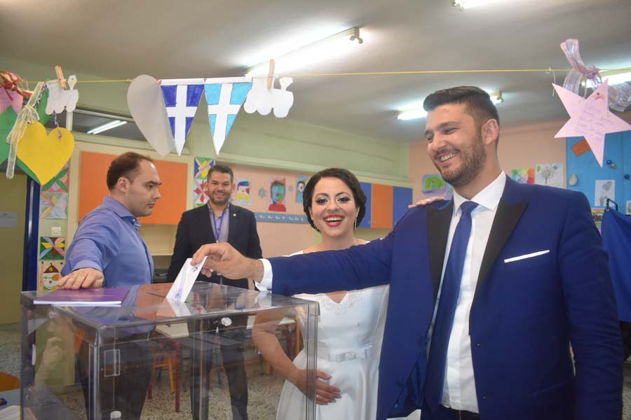 Η νύφη και ο γαμπρός έφθασαν στις 8.30 περίπου το πρωί στο εκλογικό κέντρο που λειτουργεί στο 13ο δημοτικό σχολείο στην συνοικία Αβέρωφ για να ψηφίσουν, ερχόμενοι από το νυχτερινό κέντρο όπου χθες γιόρτασαν την ένωσή τους με τα δεσμά του γάμου