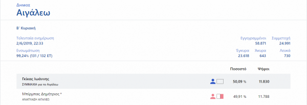 Συγκεκριμένα, ο Γιάννης Γκίγκας με τον συνδυασμό «Συμμαχία για το Αιγάλεω» είναι μπροστά με 50,09% και ακολουθεί από κοντά ο Δημήτριος Μπίρμπας με 49,91%.