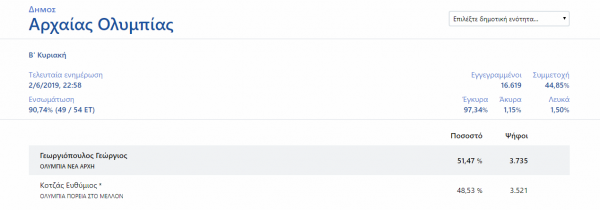 Ντέρμπι ανάμεσα στους υποψηφίους και της Αρχαίας Ολυμπίας επικρατεί αυτή την στιγμή καθώς με ενσωματωμένο το 90%, πρώτος είναι ο Γιώργος Γεωργιόπουλος με ποσοστό 51,47%, ενώ δεύτερος έρχεται ο Ευθύμιος Κοτζάς με 48,53%.