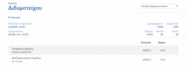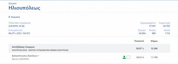 Συγκεκριμένα, ο Γιώργος Χατζηδάκης είναι αυτή την στιγμή πρώτος με 50,97% και ακολουθεί ο Βασίλης Βαλασόπουλος με 49,03%. Μέχρι στιγμής έχει ενσωματωθεί το 96,27% των ψήφων.
