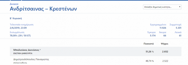 Αγωνία θα έχουν και οι υποψήφιοι στην Ηλεία και συγκεκριμένα στον Δήμο Ανδρίτσαινας, καθώς το ποσοστό ανάμεσα στον πρώτο και τον δεύτερο είναι πολύ μικρό. Συγκεκριμένα, πρώτος με ενσωματωμένο το 78% είναι ο Διονύσιος Μπαλιούκος με 51,2% και ακολουθεί ο Παναγιώτης Δημητρούλοπουλος με ποσοστό 48,7%.