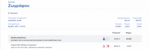 Μεγάλη αγωνία για την ανάδειξη του δημάρχου έχουν και οι υποψήφιοι στον Δήμο Ζωγράφου. Εκεί με ενσωμάτωση 96,40% πρώτος είναι ο Βασίλης Θώσας με 51, 15% , ενώ δεύτερος έρχεται μόλις με 48,85% η Σταματία Καφατσάκη- Βλάχου.