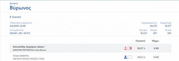 Ντέμπι μέχρι τελικής πτώσης ήταν η καταμέτρηση ψήφων στον δήμο Βύρωνος, καθώς σύμφωνα με το 100% της ενσωμάτωσης, πρώτος βγήκες ο Γρηγόρης Κατωπόδης με 50,37%. Ωστόσο για λίγο δεν κέρδισε ο δεύτερο, Χρήστος Γώγος, ο οποίος συγκέντρωσε ποσοστό 49,63%.
