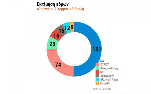 Συγκεκριμένα, οι ερευνητές έχοντας ως σημείο αναφοράς τη μέση τιμή της δημοσκόπησης για κάθε κόμμα, τονίζουν ότι στην πρώτη περίπτωση όπου η Βουλή θα είναι επτακομματική (με την είσοδο και του ΜέΡΑ25 του Γιάνη Βαρουφάκη) η Νέα Δημοκρατία καταλαμβάνει οριακώς την αυτοδυναμία με 151 έδρες.