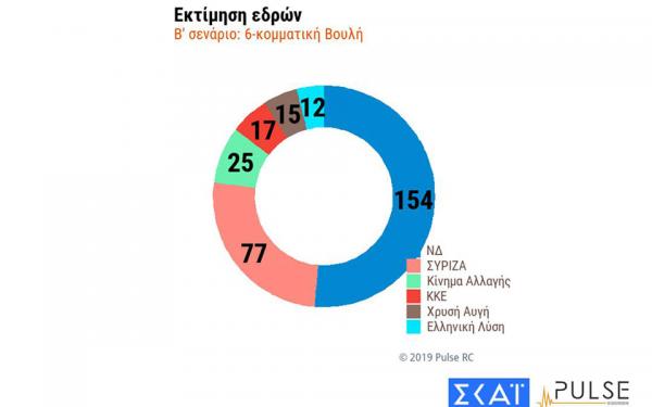 Στο δεύτερο σενάριο, όπου δηλαδή η Βουλή θα είναι εξακομματική, η αυτοδυναμία της Νέας Δημοκρατίας διευρύνεται στις 154 έδρες, με το κόμμα του Γ. Βαρουφάκη να μένει εκτός.