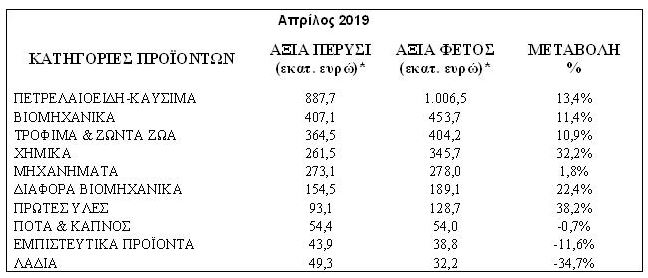 Στο πρώτο τετράμηνο του 2019 το εμπορικό έλλειμμα αυξήθηκε κατά 547,2 εκατ. ευρώ ή κατά 7,7%, στα -7,62 δισ. ευρώ από -7,07 δισ. ευρώ το αντίστοιχο διάστημα του 2018. Χωρίς τα πετρελαιοειδή, το εμπορικό έλλειμμα αυξήθηκε στα -6,11 δισ. ευρώ από -5,63 δισ. ευρώ, δηλαδή κατά 486,3 εκατ. ευρώ, ή κατά 8,6%.