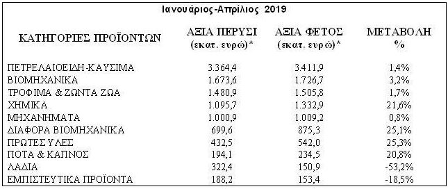 Ανάλογη είναι η εικόνα και στο διάστημα Ιανουαρίου -Απριλίου 2019, καθώς οι εξαγωγές αυξήθηκαν κατά 459,5 εκατ. ευρώ ή κατά 4,4% και ανήλθαν σε 10,94 δισ. ευρώ από 10,48 δισ. ευρώ ενώ χωρίς τα πετρελαιοειδή αυξήθηκαν στα 7,59 δισ. ευρώ από 7,16 δισ. ευρώ, δηλαδή κατά 436,4 εκατ. ευρώ ή κατά 6,1%.