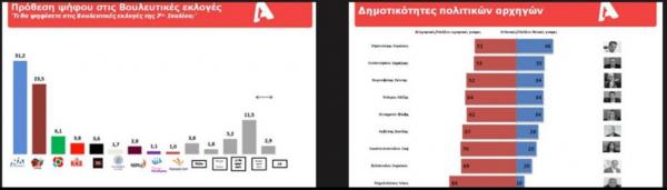 Σύμφωνα με την εταιρεία δημοσκοπήσεων Metron Analysis, για λογαριασμό του Alpha στην πρόθεση ψήφου η διαφορά είναι στις 7,7 μονάδες και με αναγωγή πάει στις 10,2 μονάδες