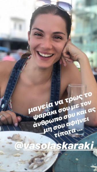 Έτσι «ανέβασε» στο insta story του φωτογραφία της Βάσως Λασκαράκη τη στιγμή του φαγητού, σχολιάζοντας αστειευόμενος: «Μαγεία να τρως το ψαράκι σου με τον άνθρωπό σου και ας μην σου αφήνει τίποτα».