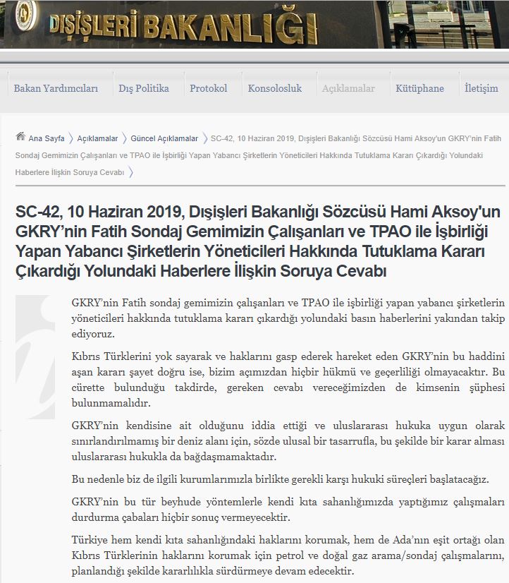 «Παρακολουθούμε με ενδιαφέρον τις πληροφορίες στο Τύπο σχετικά με τις πληροφορίες για εντάλματα σύλληψης που εξέδωσε η ελληνοκυπριακή διοίκηση για τους υπαλλήλους του γεωτρύπανου μας Φατίχ και όσων εταιρειών συνεργάζονται με την ΤPAO (σ.σ εταιρεία Τουρκικών Πετρελαίων)