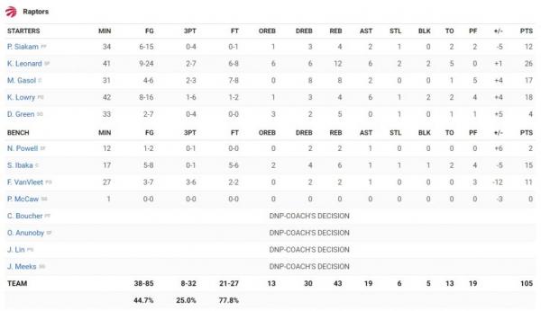Από την άλλη, ο Λέοναρντ με 26 πόντους και 12 ριμπάουντ ήταν ο κορυφαίος των Ράπτορς, 18 πρόσθεσε ο Λάουρι, 17 ο Γκασόλ αλλά δεν έφτασαν.