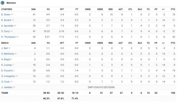 Ο Κάρι ήταν ο κορυφαίος για τους νικητές με 31 πόντους, 8 ριμπάουντ και 7 ασίστ, ο Τόμπσον ακολούθησε με 26 πόντους και 7/13 τρίποντα ενώ 14 είχε ο Κάζινς.